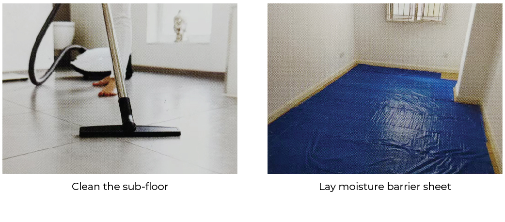 Continuous installation area limit is 5x10m before separation T-profile required and must be installed with full accessories. Sub-floor must be flat (tolerance is 3mm/meter) and dry prior to installation.